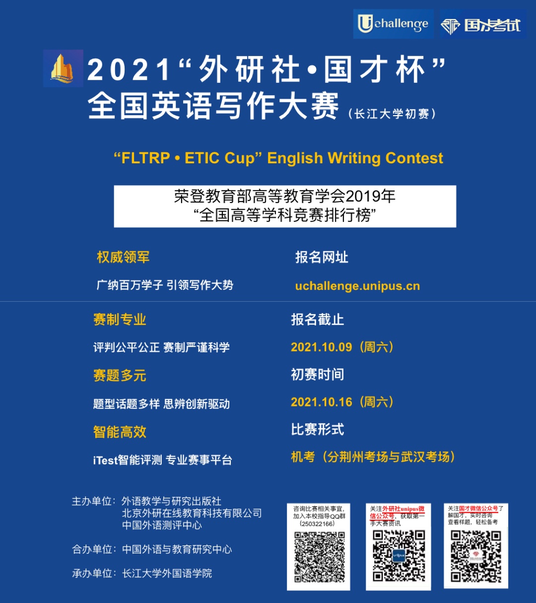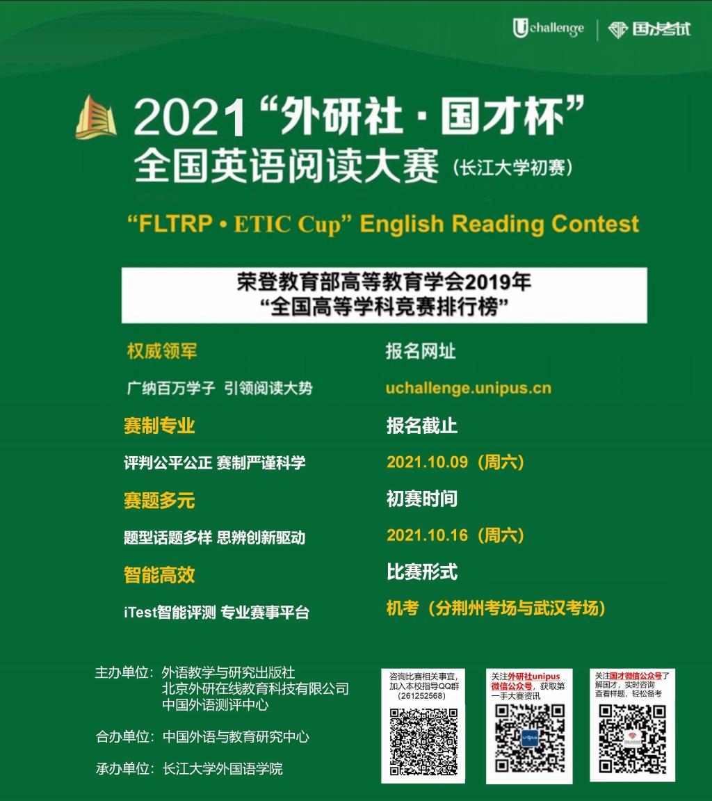 2021“外研社•国才杯”全国英语阅读、写作大赛火热报名中该赛事为公益性赛事,不收取报名费,欢迎长江大学在校生踊跃报。