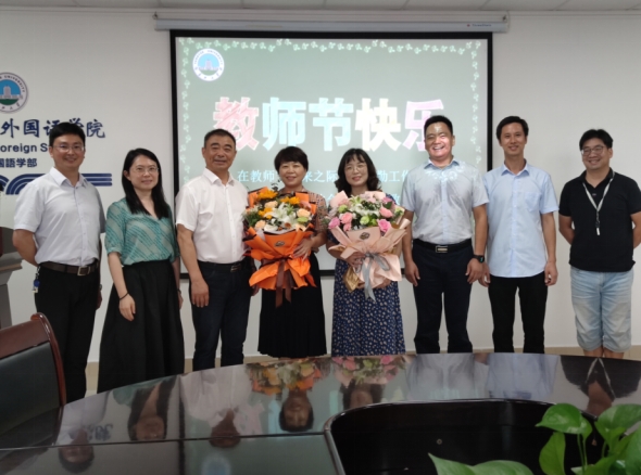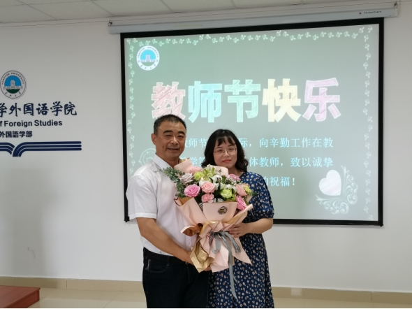在文科楼712会议室,周从标副校长为我院从教30年教师代表谈宏慧教授、2021年“任大龙奖教金”获得者樊辉老师献上了鲜花,并送上节日的祝福。