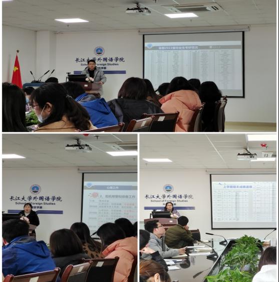 随后,各年级辅导员分别就3月份的班主任工作进行了说明,2018级年级辅导员车桥老师重点梳理毕业生考研及就业问题、2019级年级辅导员许泽琼老师就共青团工作和返校学生心理健康关注问题进行了说明,2020级辅导员童超老师就学生事务管理方面问题进行了重点讲解。
